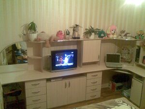 Продаётся стенка.Будуар+тумбочка-подставка под ТВ+компьютерный стол, цвет дуб-молочный, длина 3,3м, высота 1,6м, отличное состояние. |