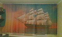 Фотоштора с изображением Корабля. Смотрится великолепно!!! Ширина 4.14 м - три по 1.65м. Высота 1.65 м. Ткань - шифон. Подходит для детской и кухни. |