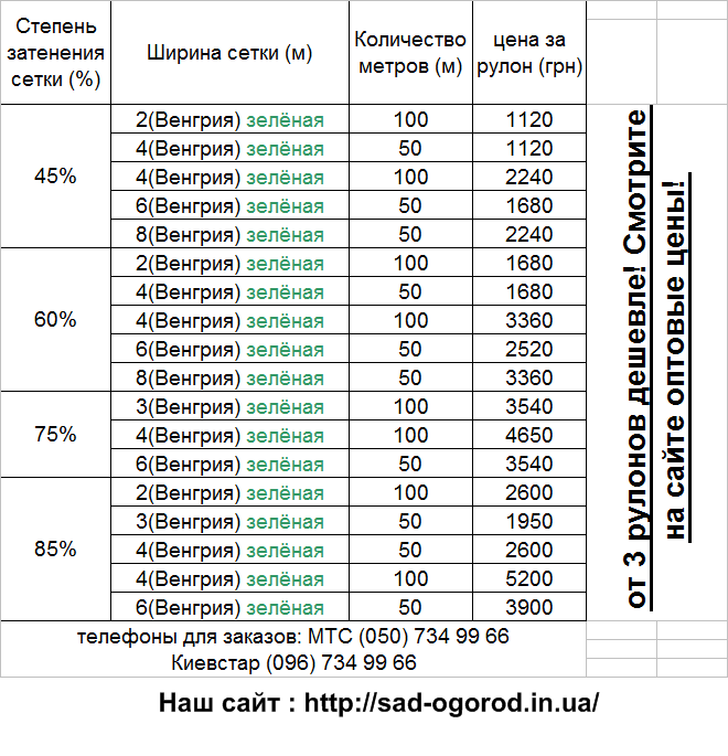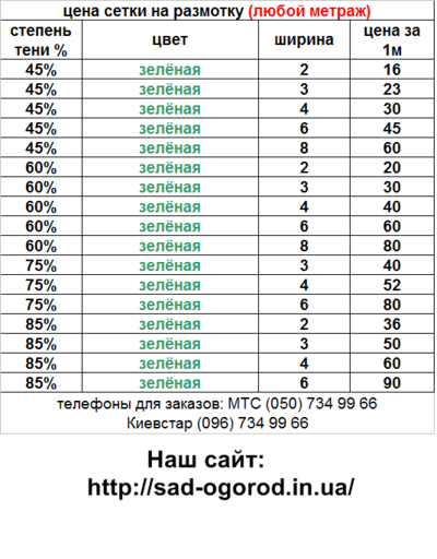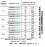 Продам черное, черно-белое агроволокно,а также затеняющую сетку в рулонах и на любой метраж. Ширина черного - 1,05, 1,6 и 3,2; черно-белого: 1,6 и 3,2м Ширина сетки : от2 до 8м. Затеняемость колебается от 45 до 85%. Подробную информацию найдете на нашем сайте http://sad-ogorod.in.ua/. Для заказа звоните нашему менеджеру по тел. : 0507349966 или 0967349966. |