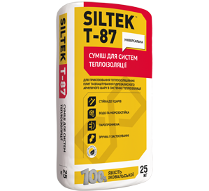 смесь для систем теплоизоляции Т-87 Siltek для приклеивания всех типов теплоизоляционных плит (пеностекла, стекло или каменной ваты, гранулированного или экструдированного пенополистирола и т.д.) и устройства на их поверхности гидрозащитного армирующего слоя перед отделкой декоративными материалами. Разрешается приклеивание декоративных элементов из пенополистирола внутри и снаружи зданий.