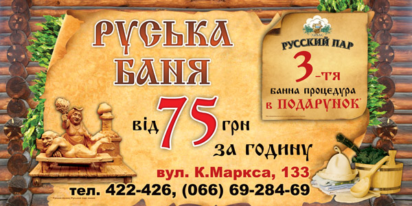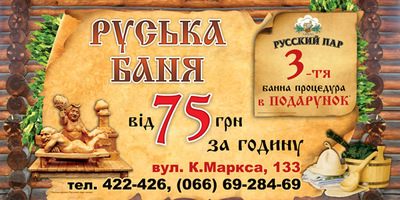 Банный клуб "Русский пар" приглашает всех отдохнуть, набраться сил и здоровья! Летняя акция: стоимость 1 часа банного времени 75грн (до 6 гостей)! Третья банная процедура в подарок! К услугам наших гостей банный комплекс, состоящий из парной, душевой, зоны отдыха у бассейна, трапезной и массажной комнат, а также открытой летней площадки. Обслуживание гостей проводится квалифицированным, специально обученным персоналом, владеющим технологическими особенностями, методами банных процедур и техникой старорусского массажа. Баня парит - силу дарит! (0552) 422-426 (066) 69-284-69 г.Херсон, ул.Карла Маркса, 133,(район переулка Казацкого) |